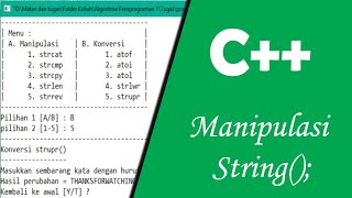 Bahasa C++ adalah perkembangan dari bahasa C. Salah satu hal yang dipelajari dalam bahasa C++ adalah Manipulasi string. Manipulasi string : - strcat() ...